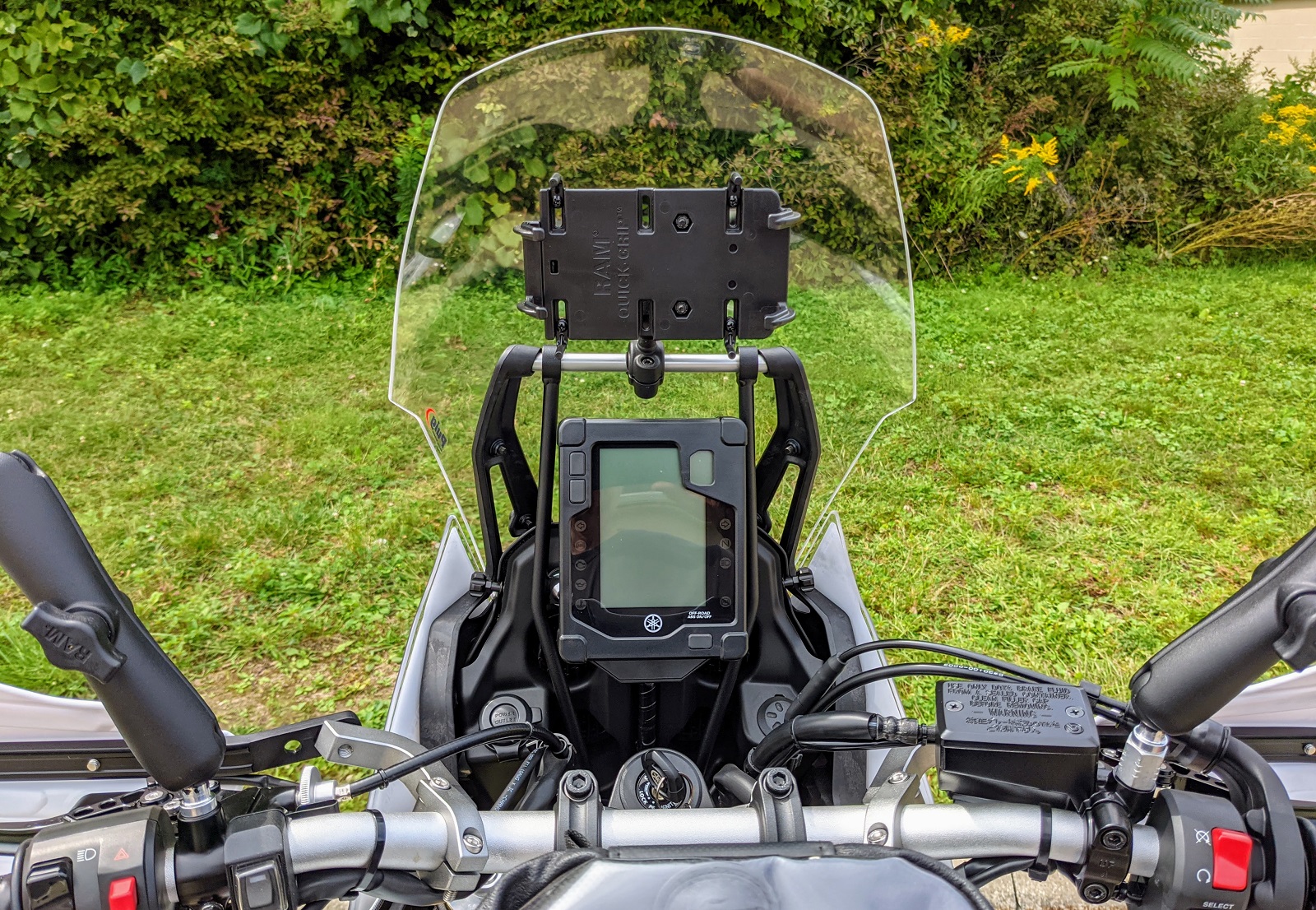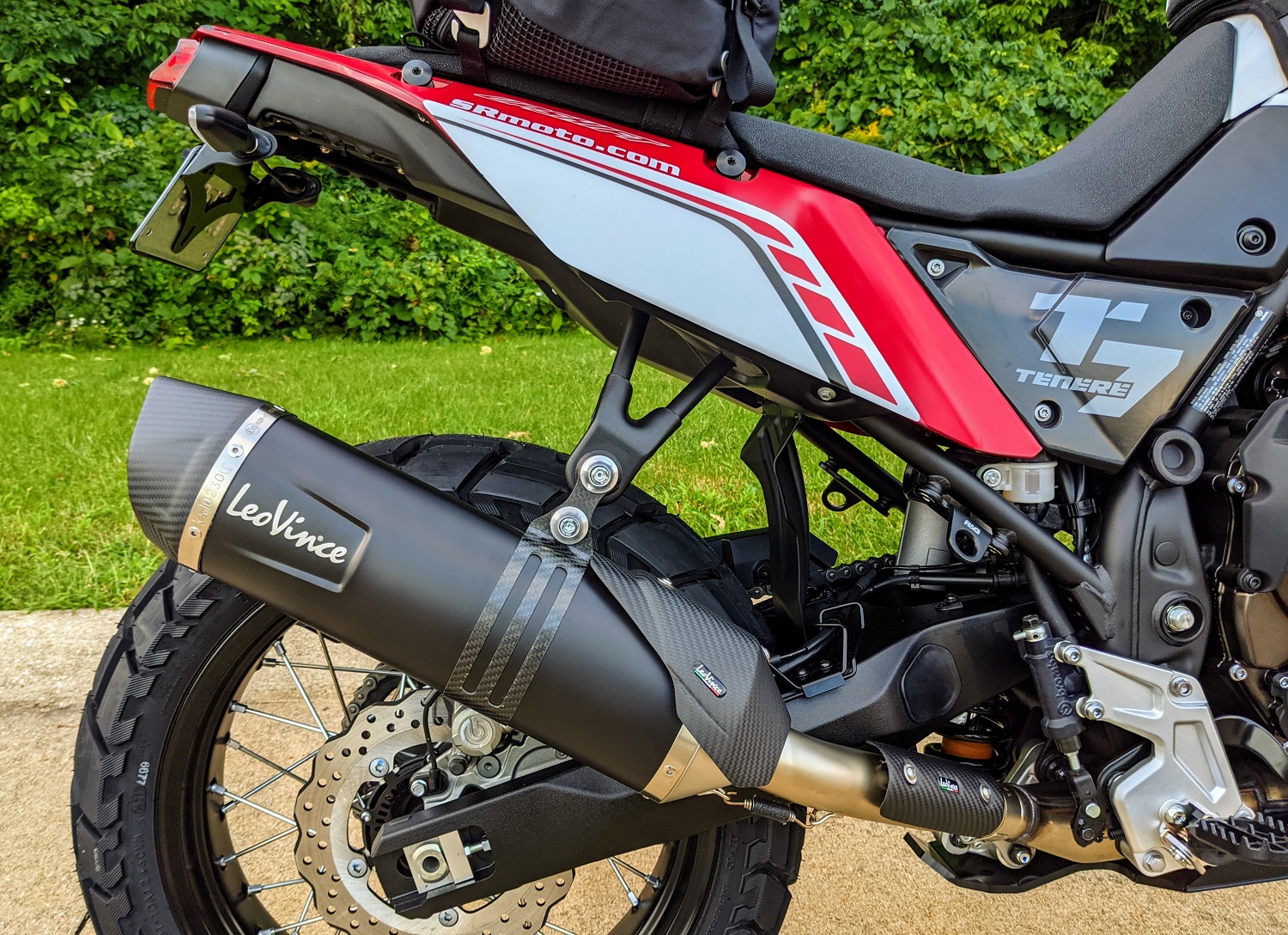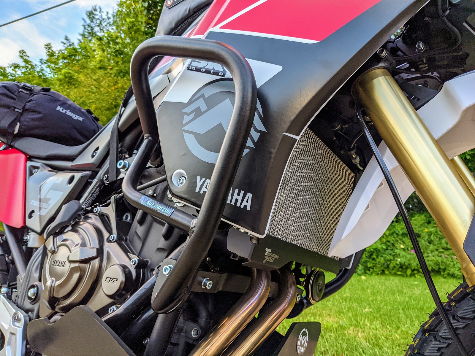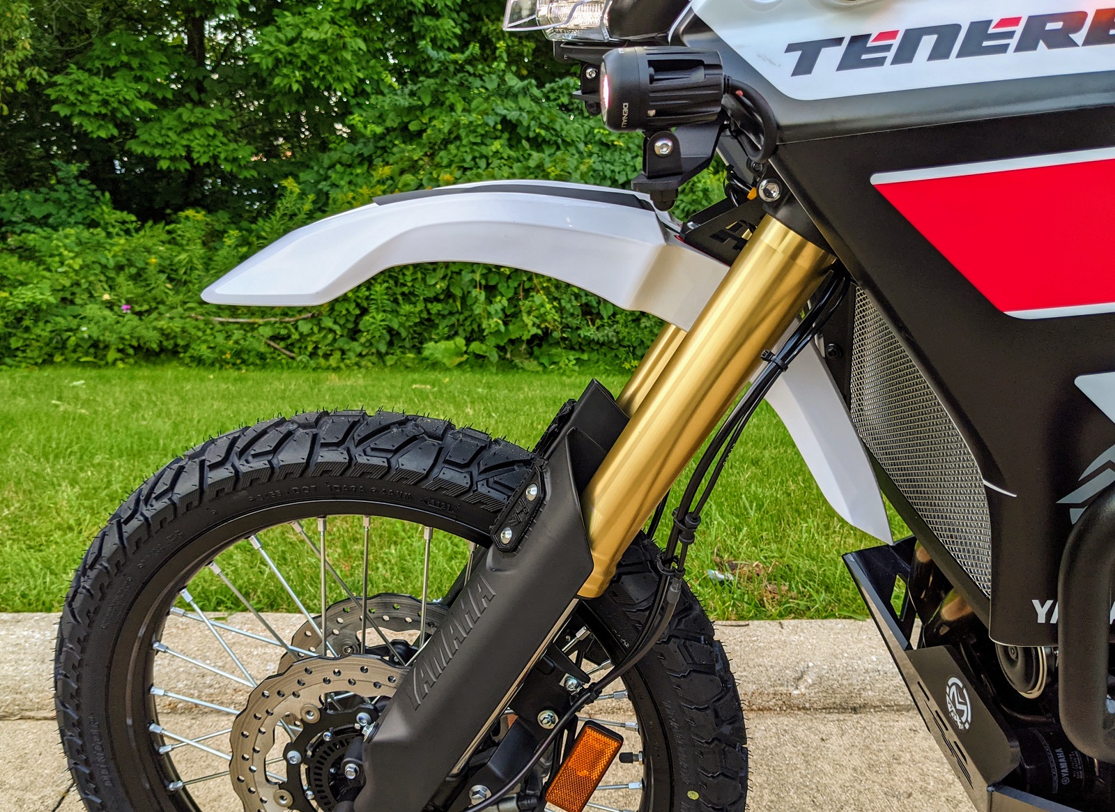 We wanted front auxiliary LED lighting so our Tenere 700 stands out more in traffic, and also to provide better lighting if we ever get caught out on the road/trail after dark. We’ve used Denali lighting on a few other bikes, and it is super high quality stuff. We went with their small DM line of LED lights, and mounted them to the Denali Auxiliary Light Mount they make for the Tenere 700 that bolts up under the stock headlight. Now we’re much more visible on the road, and the super bright LED’s will also work great after dark. I definitely recommend getting the Denali Dual-Intensity Controller, which allows you to use your bike’s high/low beam switch to change the DM’s from half bright to full bright . If you don’t get that controller, then you control the lights from the on/off handlebar switch, so they are either off or full bright, and when they are full bright I think it’s a bit too much for on-coming traffic.