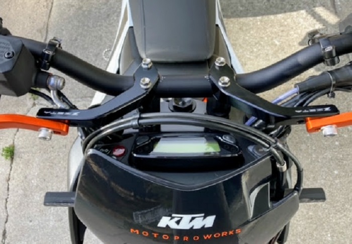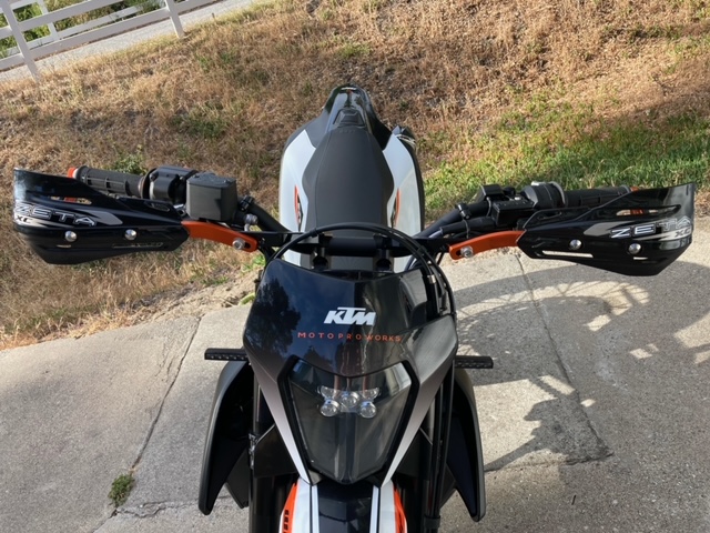 A customer of ours sent us the photos shown above, of the Zeta PRO Armor handguards, on his KTM 690 SMC R. He’s installed the Zeta PRO Armor handguards in Anodized Orange, with Black XC Protectors, and the BC Mount Type mounting kit, which attaches the in-board part of the handguard to the handlebar mount location, and replaces the stock upper handlebar mount.
